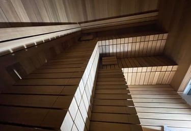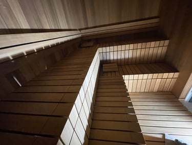 Na życzenie klienta zaprojektowaliśmy unikalny wzór ławek, które razem z oparciami wykonaliśmy z thermo abachi. Dzięki temu sauna wyróżnia się nie tylko wysoką jakością wykonania, ale także niepowtarzalnym designem, idealnie komponującym się z basenem w pobliżu. Dzięki zastosowaniu thermo abachi, sauna charakteryzuje się doskonałą trwałością, eleganckim wyglądem i komfortem użytkowania. To idealne miejsce na relaks po kąpieli w basenie.