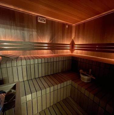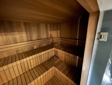 Dla komfortu użytkowników zamontowaliśmy duże drzwi, które nadają wnętrzu przestronności i nowoczesnego charakteru. Ławki oraz oparcia wykonaliśmy z thermo abachi, które nie nagrzewa się nadmiernie i doskonale komponuje się z eleganckim cedrem japońskim, tworząc harmonijną całość. Dzięki zastosowaniu naturalnych i trwałych materiałów, sauna nie tylko zachwyca wyglądem, ale również gwarantuje długowieczność i wyjątkowy komfort użytkowania.